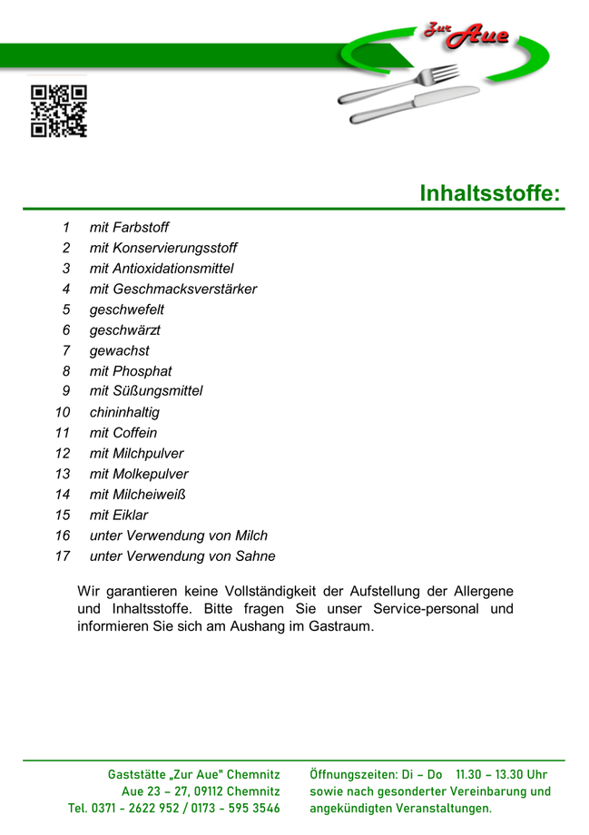 Allergene und Zusatzstoffe werden entsprechend mitgeteilt und können auch im Aushang nochmals eingesehen werden.