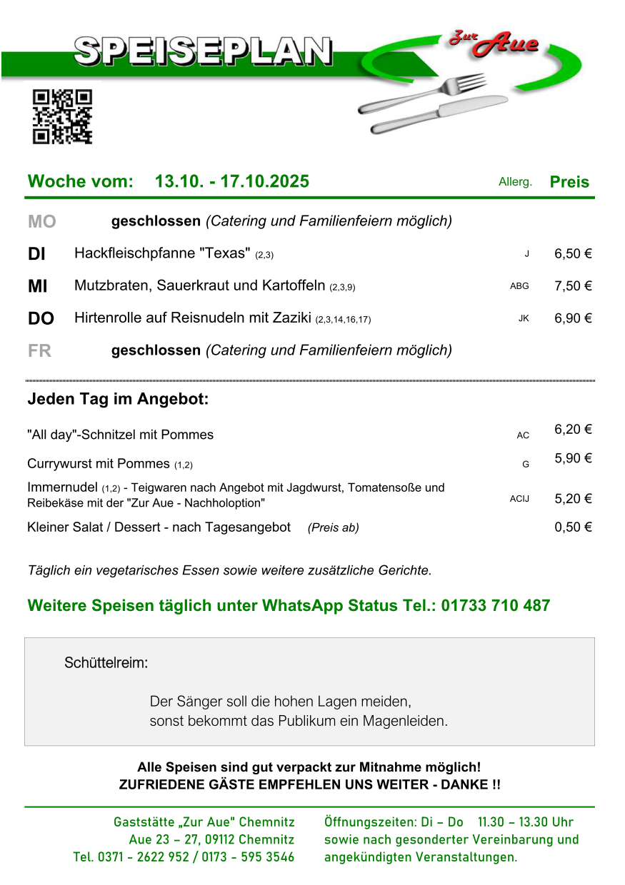 Unserer Speisepläne können sie wöchentlich hier abgerufen. Sie erscheinen jeweils für 2 Folgewochen und teilen Ihnen so auch rechtzeitig mit, wann beispielsweise Betriebsruhe oder Unterbrechnungen wegen Urlaub und Ferien im Gaststättenbetrieb sind.